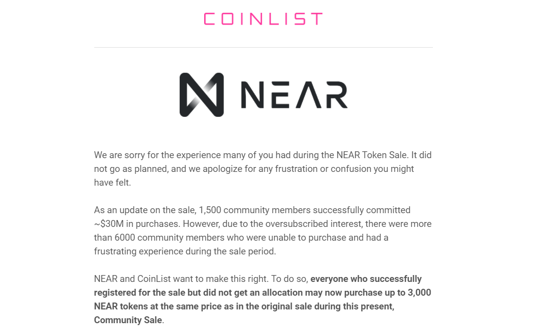 이번의 불안정한 플랫폼 운영 및 토큰세일로 인해 CoinList는 CoinLost라는 별명을 얻게 될 정도로 NEAR토큰의 인기는 어마무시했습니다. 전체 동시접속자 수가 무려 7,500명 가량 되었고 이중 1,500명이 3,000만 달러를 구매했다는 점이 그 인기를 실감하게 하네요.