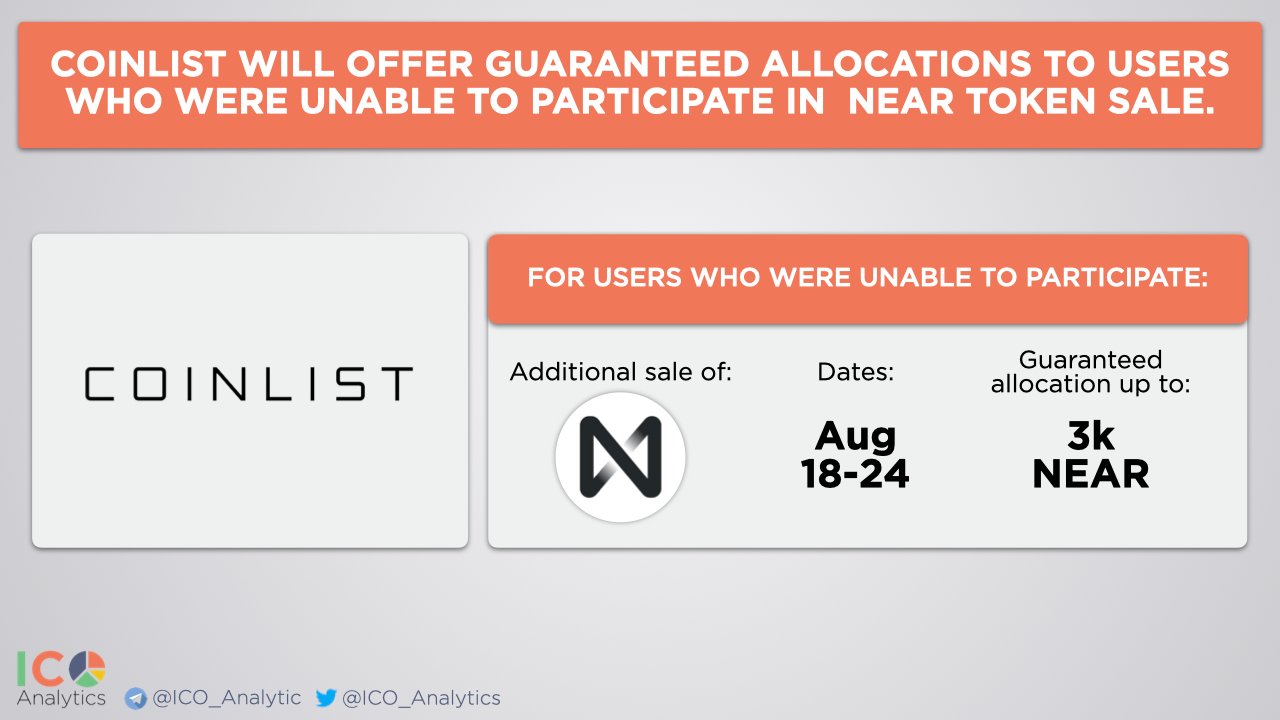 지난 8월 12일에 코인리스트(CoinList)에서 인기리에 마감되어 버렸던 NEAR토큰 세일에 시스템 상의 결함이 많았던 관계로, 코인리스트와 NEAR팀에서는 KYC까지 완료하였으나 토큰세일에 참여하지 못한 유저들을 대상으로 8월 18일부터 24일까지 추가세일을 진행합니다.