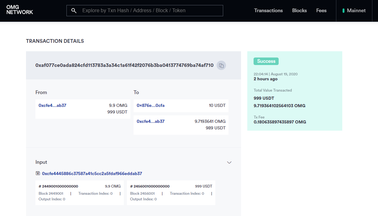 현재 OMG Network 메인넷 v1의 블록익스플로러를 확인해보면 USDT의 발행 및 전송이 가능해진 것을 확인하실 수 있습니다.