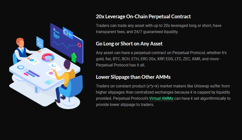 Perpetual Protocol은 최대 20배까지의 온체인 영구 계약을 통한 롱/숏이 가능한 디파이 플랫폼으로 금, 법정화폐(환율), 비트코인, 비트코인캐시, 이더리움, 리플, 이오스, 라이트코인, 제트캐시, 모네로 등 다양한 디지털자산들까지 지원을 합니다. 유니스왑과 같은 다른 AMM방식의 디파이 플랫폼들과 마찬가지로 거래 상대방이 없이도 vAMM(Virtual Automated Market Maker)와의 거래를 지원하며 현재는 Ropsten testnet에서 테스트 단계에 있으며 코드 감사가 완료되는대로 곧 메인넷이 런칭될 것으로 보입니다.