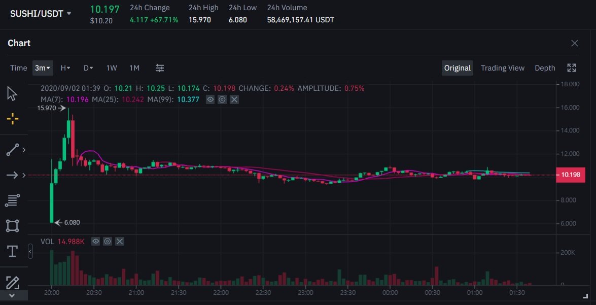 현재 스시스왑은 출시 3일 만에 총락업가치(TVL) 7억 달러를 돌파하며 거버넌스 토큰인 SUSHI토큰이 엄청난 가격 상승을 보이고 있으며, 바이낸스에서 약 10달러 정도에 가격이 유지 중에 있습니다.