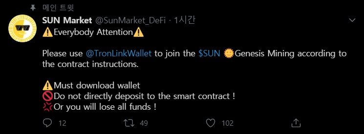 위의 주소가 아닌 다른 접속 주소는 스캠사이트일 확률이 높으므로, 잘못 접속하지 않도록 주의하시기 바라며, SUN토큰 관련 공식 발표 등은 아래의 공식 링크를 통해서만 전달 받으시는 것을 추천합니다.