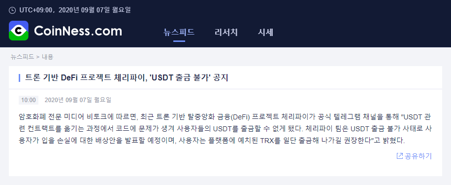 금일 코인니스의 뉴스에서도 확인하신 분들이 있으시겠지만 체리파이라는 트론 기반의 디파이 프로젝트에서 "USDT관련 컨트랙트 코드에 문제가 생겨 사용자들이 스테이킹한 USDT의 출금이 불가"하다는 공지가 있었습니다.
