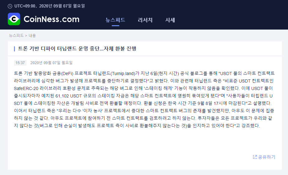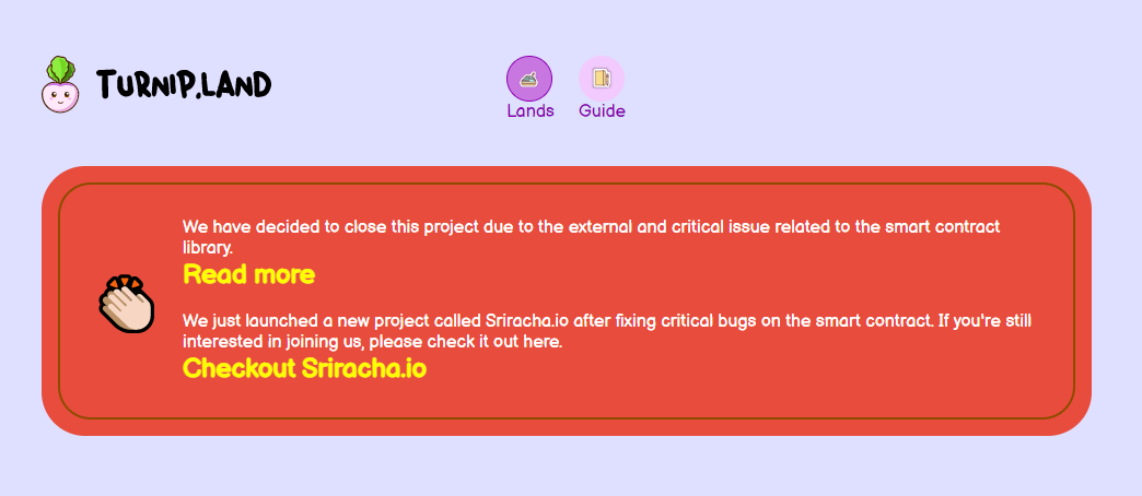 지난 9월 4일에 런칭한 터닙랜드(Turnip.land) 프로젝트 팀은 런칭일 이후 하루 만에 200,000달러 이상의 락업자산을 모금하였으나, 첫 번째 채굴풀인 USDJ에 이어 두 번째 채굴풀인 USDT를 추가한 뒤에 디파이 프로젝트가 사용하고 있는 스마트 컨트랙트 라이브러리의 중요 문제를 발견했다고 공지를 하였습니다.