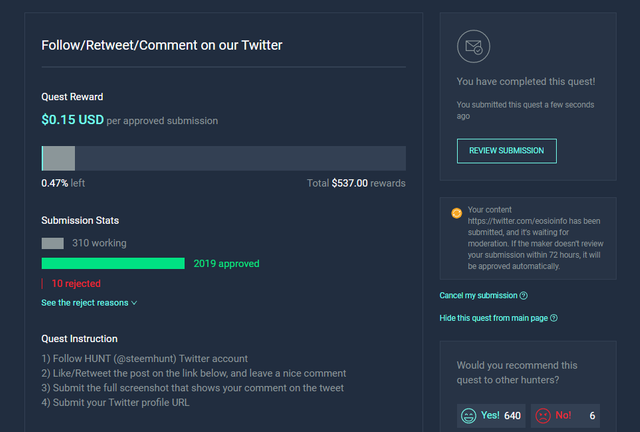 그러면 이렇게 정상적으로 제출이 되고, 메이커의 승인을 기다리게 됩니다. 해당 퀘스트를 만든 메이커가 제출내역들을 보고 요구사항에 맞게 퀘스트를 수행했는지 확인 후 승인을 해 주어야지만 정상적으로 헌팅이 완료됩니다.