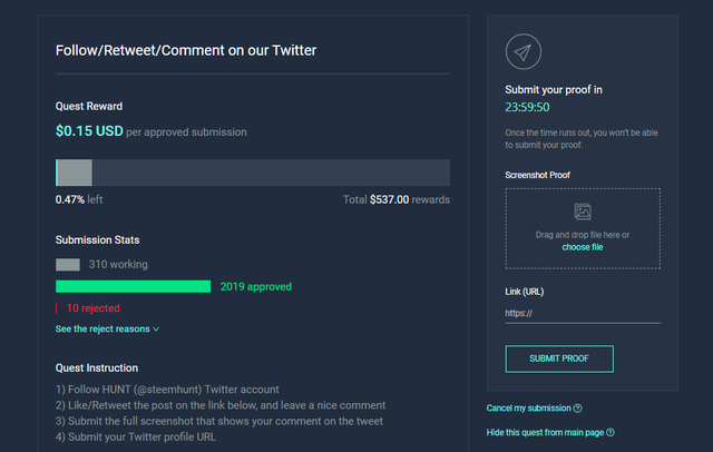 그 다음 퀘스트 요구사항에 맞춰 스크린샷을 첨부하고, 내 트윗 URL을 입력한 뒤에 Submit Proof 버튼을 클릭합니다.