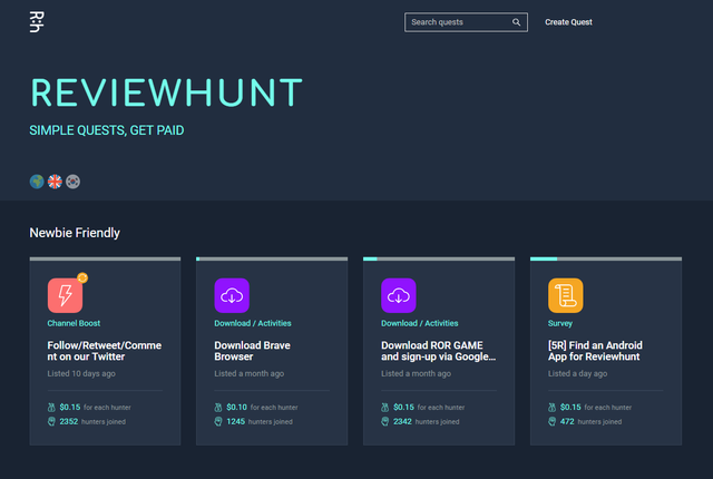 리뷰헌트에 접속하면 일단 위와 같이 수행가능한 퀘스트의 리스트가 나오는데, 기본적으로 퀘스트는 타겟 국가(언어)에 따라 구분이 됩니다.