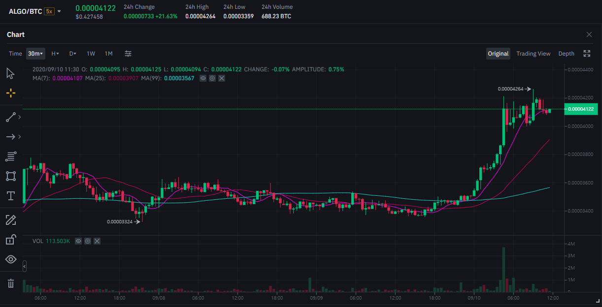 이에 따라 BTC의 단기 하락과 함께 주저 앉았던 ALGO의 가격이 급격하게 회복되고 있는 모습을 보여주고 있습니다.