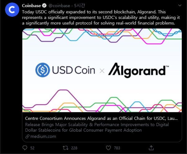 해당 소식을 코인베이스에서도 공식 트위터를 통해 발표하면서 USDC의 확장성과 유틸리티의 엄청난 개선이 있을 것이라는 기대감을 보여주었고,