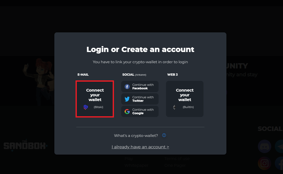 LAND토큰 세일에 참여하기 위해서는 먼저 더 샌드박스 플랫폼에 가입부터 진행을 해야 하는데, 별도의 메타마스크 설치 없이도 Bitski라는 월렛 계정을 생성하여 아주 간단하게 계정 및 지갑을 생성하실 수 있습니다.