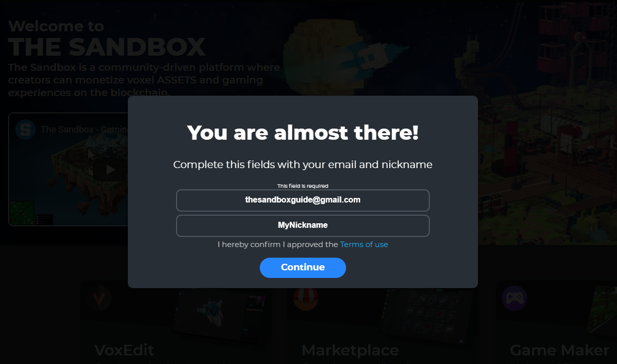 ⑨ 가입시 사용한 이메일이 맞는지 확인하고, 더 샌드박스에서 사용할 나만의 닉네임을 설정해주세요.