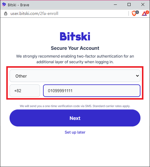 ⑤ 휴대폰의 경우에는 Other를 선택하고 +82를 입력한 뒤에 휴대폰 번호를 입력하여 설정합니다.