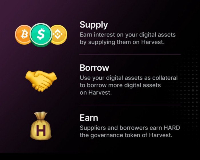 Harvest에 디지털자산의 유동성을 공급하거나, 디지털자산을 빌리는 사용자들은 Harvest의 거버넌스 토큰인 HARD를 보상으로 얻을 수 있습니다.
