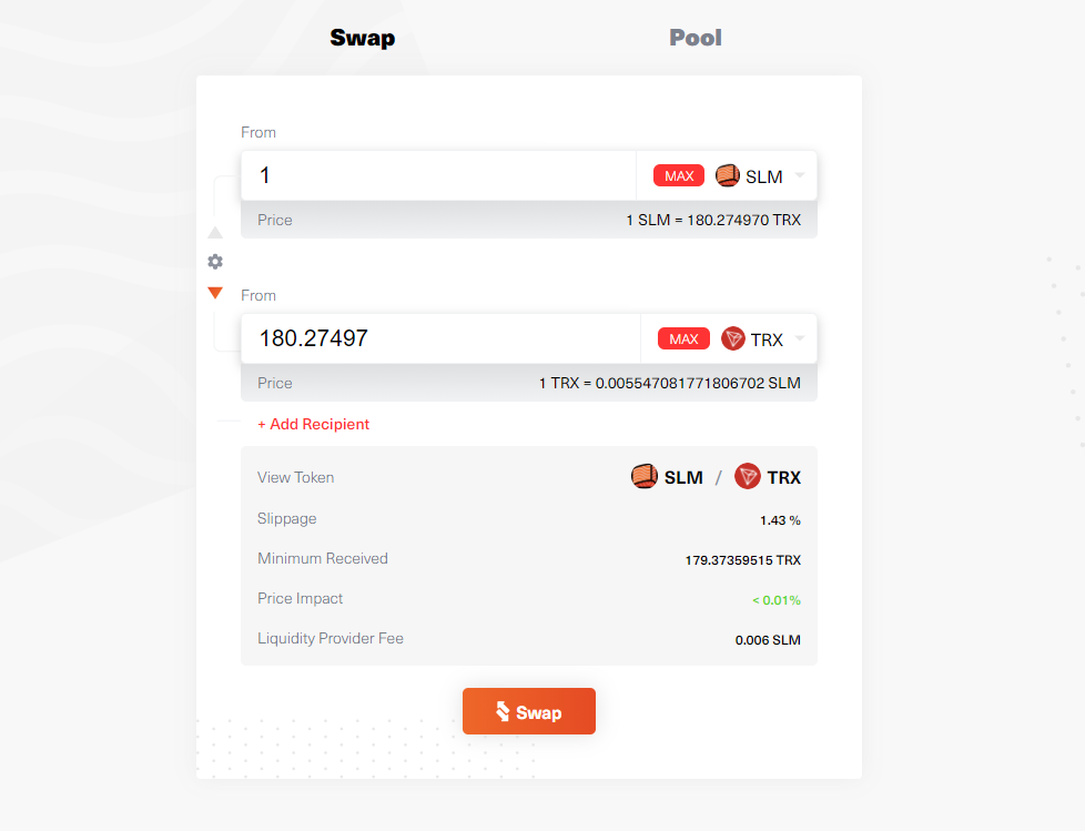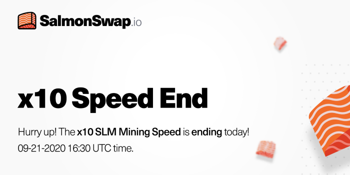 안녕하세요, 디온입니다. 살몬스왑(SalmonSwap)의 10배속 유동성공급 마이닝이 우리나라 시간 기준으로 9월 22일 01:30에 종료됩니다. 이로 인해 그동안 살몬스왑에서 SLM/USDT, USDT/TRX, CRT/USDT, PEARL/USDT, TAI/USDT의 유동성 공급을 통해 채굴이 가능했던 SLM토큰의 채굴량은 10분의 1로 줄어들게 됩니다.