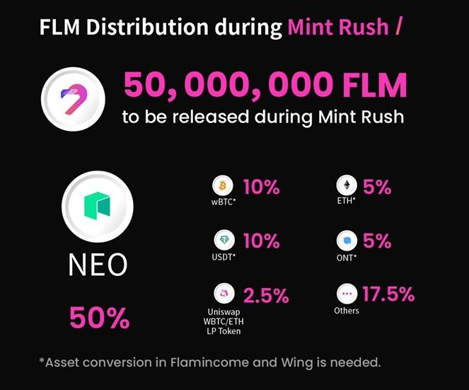 현재까지 Mint Rush 단계에서 FLM 토큰 채굴에 참여할 수 있는 디지털 자산은 NEO, wBTC, ETH, USDT, WBTC/ETH LP, ONT까지 총 6개이며, 이 중에서 NEO에 배정된 비율이 50%로 압도적으로 높습니다.