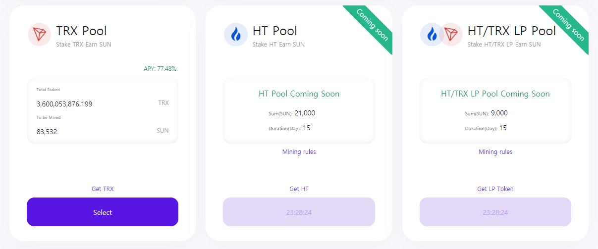 - HT/TRX LP Pool 마이닝 리워드 : 600 SUN/일, 15일간