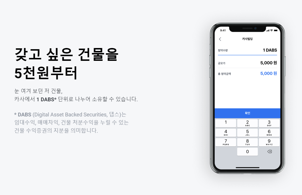 DABS란 Digital Asset Backed Securities의 약자로 디지털 유동화 증권 또는 부동산 유동화 수익증권으로 부를 수 있는데 임대수익, 매매차익, 건물 처분수익을 누릴 수 있는 건물 수익증권의 지분을 의미하며, 카사 앱에 내 은행계좌를 연결하여 자유롭게 사고 파는 것이 가능합니다.