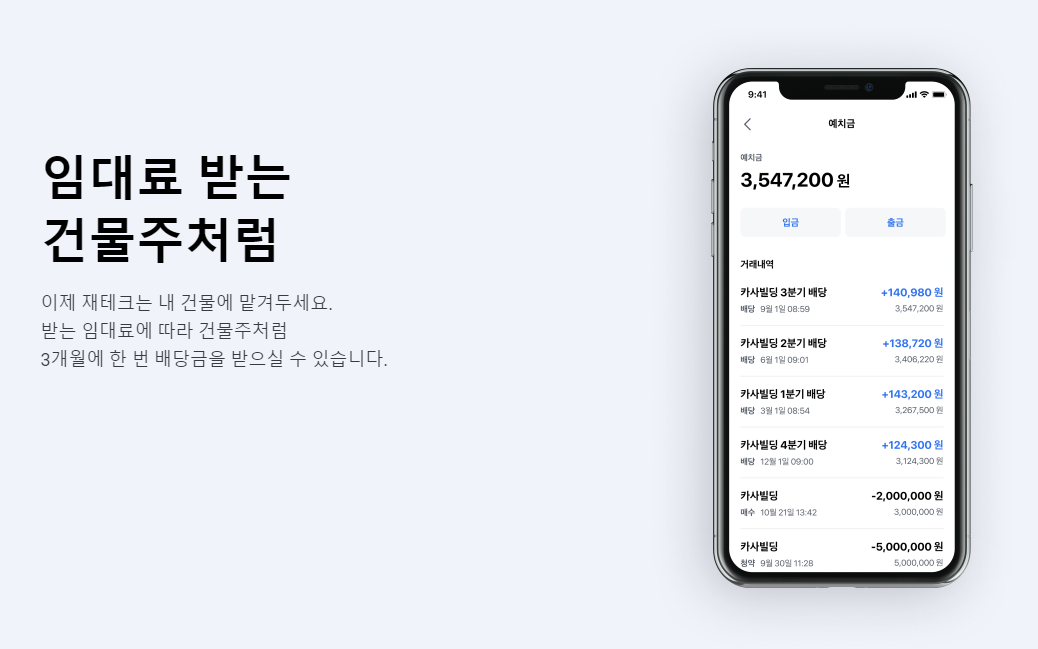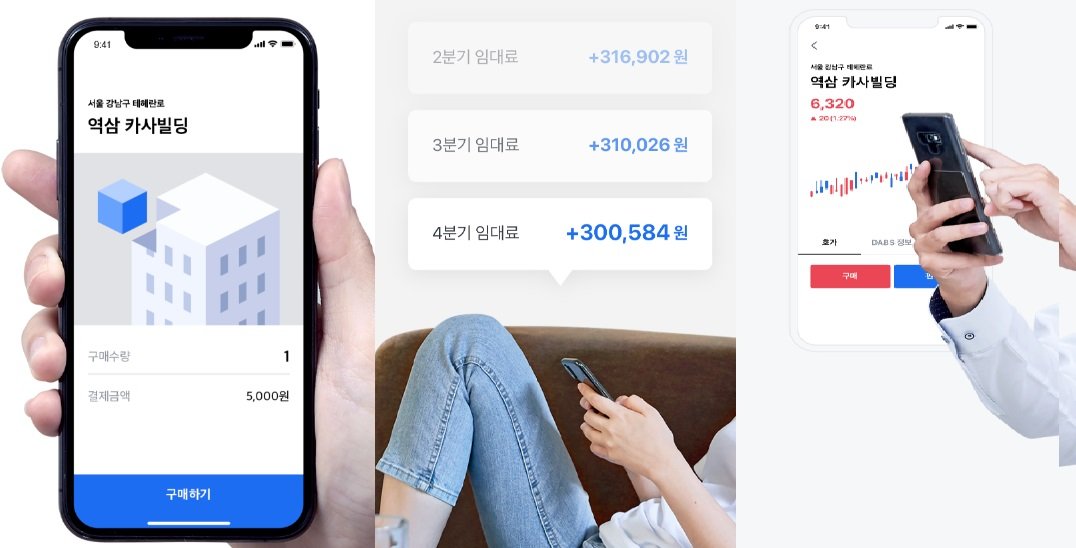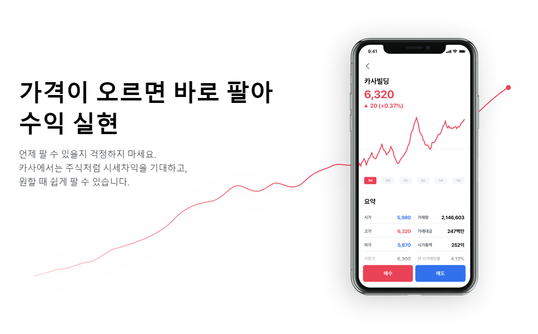 건물 상장을 원하는 소유주가 거래소(카사 앱)에 상장을 신청하면 감정평가법인에서 건물 가격 감정을 진행한 뒤에 건물의 소유권이 부동산 신탁회사로 넘어가고, 산정된 건물 가격을 바탕으로 은행과 신탁회사는 수익증권을 상장합니다. 그리고 카사앱에서 이 증권을 상장하면 일반 투자자들이 이를 주식처럼 실시간으로 자유롭게 사고팔 수 있게 되는 구조입니다.