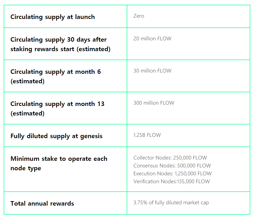 코인리스트에서의 토큰 세일을 포함하여 배포되는 모든 FLOW토큰에는 전송제한 조건이 붙어 있습니다. 따라서 첫 해에 시중에 유통되는 토큰은 밸리데이터 노드 운영자에게 지급되는 보상 뿐이며, 메인넷 출시 후 30일 동안 밸리데이터 노드 운영자에게 2,000만 개의 FLOW토큰이 공급됩니다.