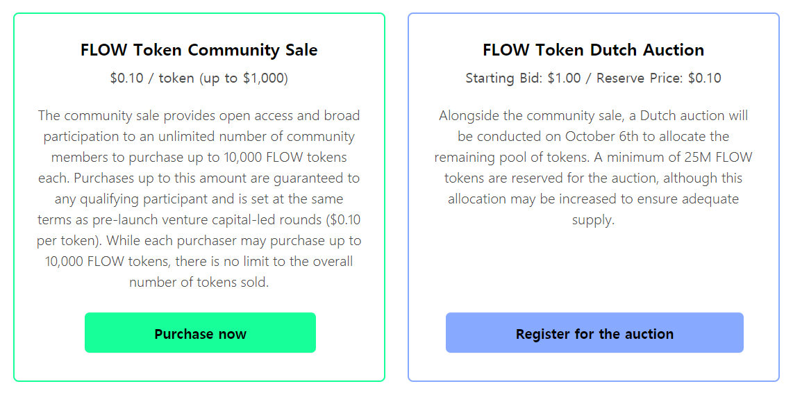 FLOW 토큰 판매는 ①개당 0.1달러에 최대 10,000개까지 구매가 가능한 1,000달러 캡의 커뮤니티 세일과 10월 6일부터 진행되는 ②시작가 1달러에서 시작하는 더치 옥션 판매 2가지로 나뉘어져 있습니다. 개인당 1,000달러 캡이 있는 FLOW 커뮤니티 세일이 부족하신 분들은 해당 더치옥션에 참여하시면 추가로 토큰을 구매하실 수 있습니다.