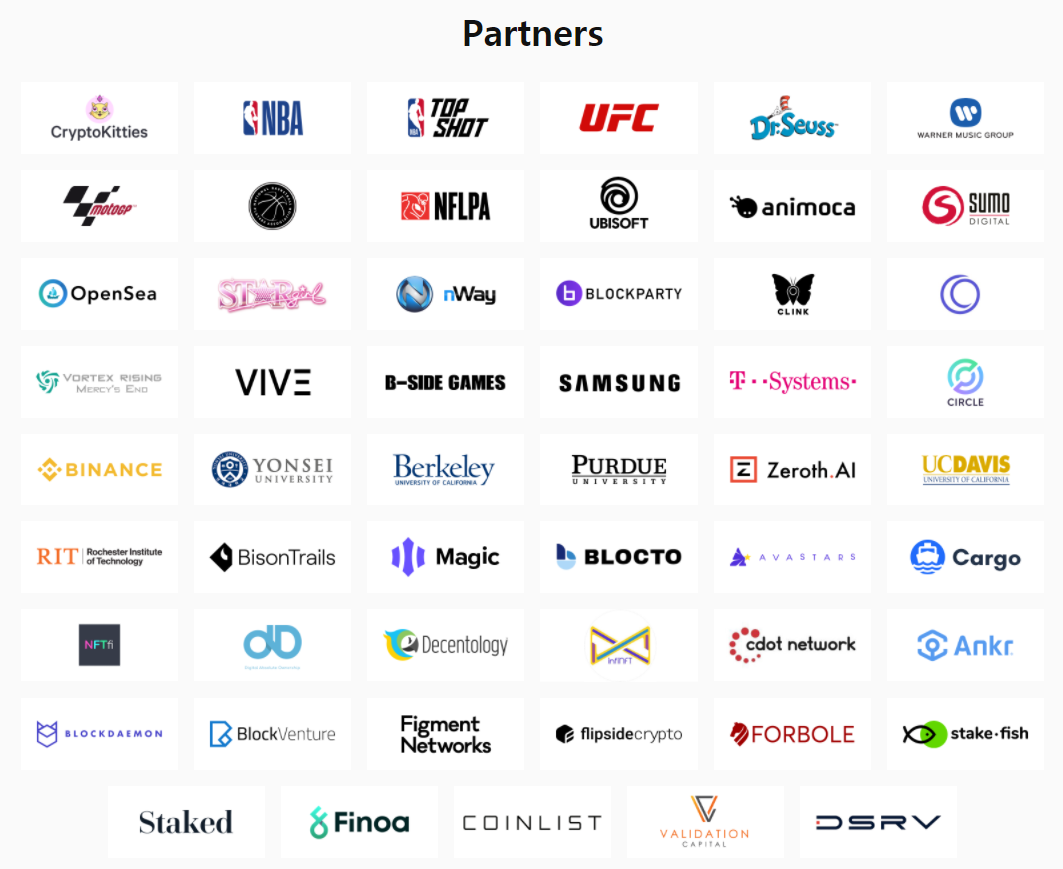 거기에 더불어 파트너 사의 리스트만 살펴보더라도 Flow체인의 런칭과 함께 블록체인 기반의 게임들을 즉시 런칭할 수 있는 역량이 충분한 팀들이 대기 중인 것을 확인할 수 있으며, 버클리, UC데이비스, 퍼듀 대학 등 미국의 대학들과의 공동 연구도 함께 진행하고 잇는 것을 확인할 수 있습니다.