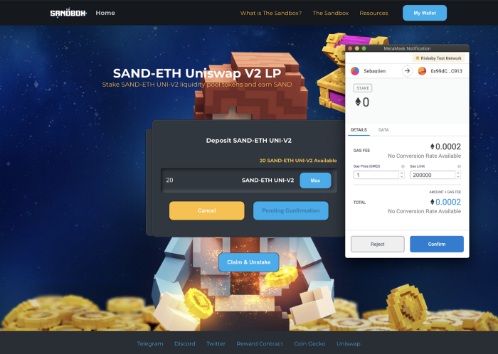 안녕하세요, 디온입니다. 더 샌드박스의 네이티브 토큰인 SAND토큰의 유동성을 유니스왑에 공급하고 70,000달러 상당에 해당하는 SAND토큰을 채굴할 수 있는 유동성 마이닝 프로그램이 오늘(9월 25일)부터 시작되었습니다. 이제부터 개인 지갑에 SAND토큰과 ETH를 가지고 계시는 분들은 유니스왑에서 SAND/ETH 유동성을 제공하고 150만 개의 SAND토큰을 자신의 비율에 따라 채굴하실 수 있습니다.