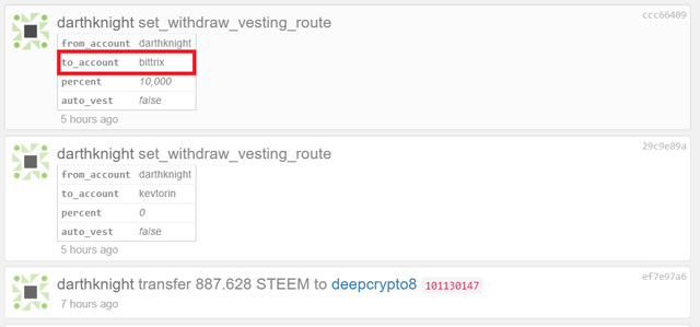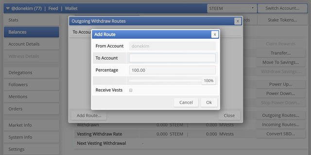 withdraw vesting route라는 기능은 파워다운으로 받게되는 리퀴드 토큰이 본인이 아닌 다른 계정으로 전송되도록 자동 설정하는 우회 기능입니다.