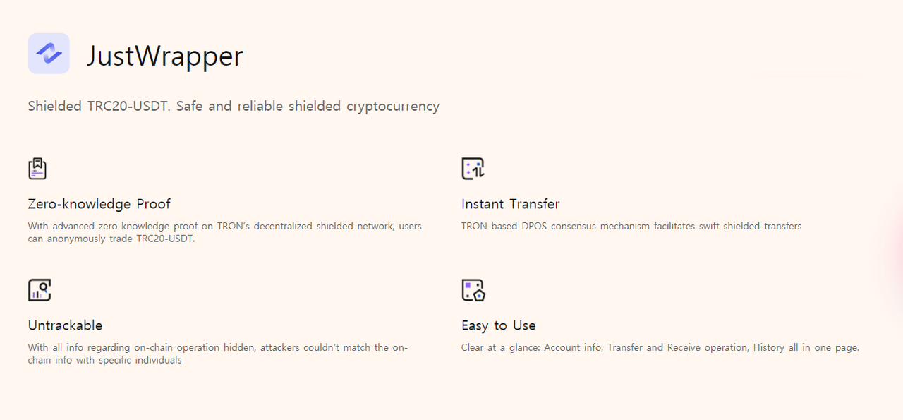 TRONZ라는 이름으로 시작되었던 토큰리스 스마트 컨트랙트(tokenless smart contract) 기반의 개인정보 보호 프로토콜로 현재는 TRONZ에서 JustWrapper로 이름이 변경되었으며 트론 네트워크에서 표준 TRC20 토큰들의 보안(익명) 전송을 지원합니다.