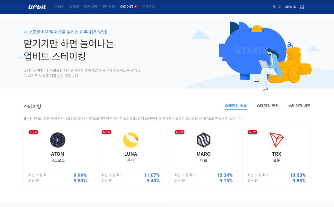 업비트에서도 다른 거래소들의 추세에 따라 디지털자산(암호화폐) 스테이킹 서비스를 시작하네요. 베타 서비스로 오픈된 현재 상태에서 지원되는 자산은 코스모스(ATOM), 루나(LUNA), 마로(MARO), 트론(TRX)까지 총 4가지입니다.