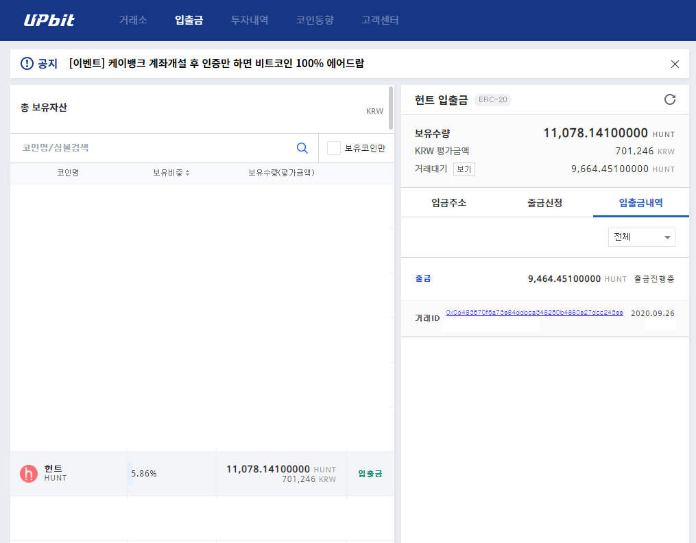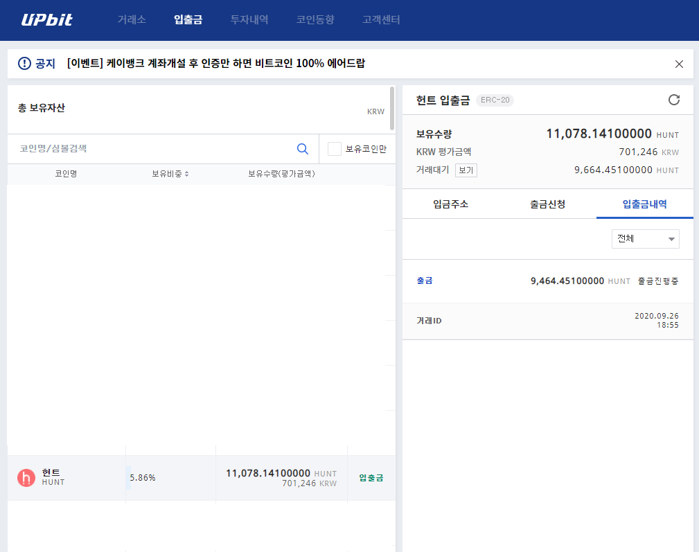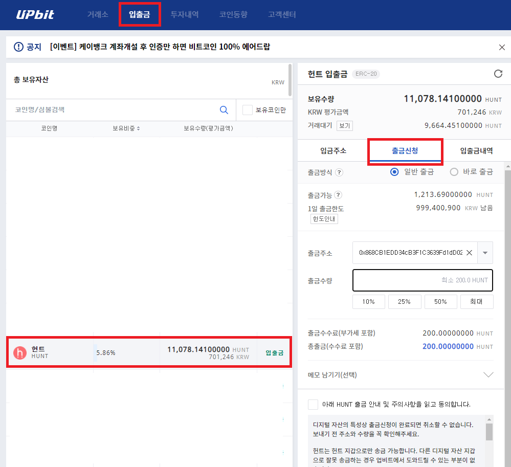 ⑫ 업비트에 로그인 후 [입출금] - [HUNT검색 및 선택] - [출금신청] 순으로 접속합니다.