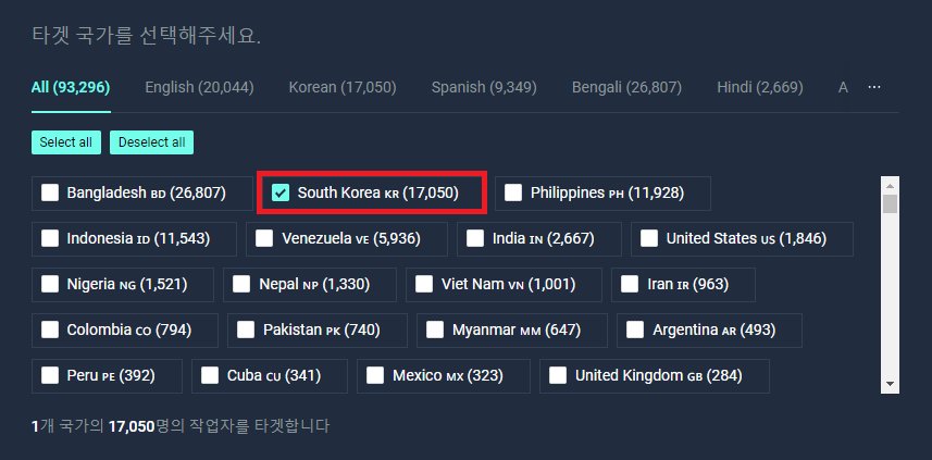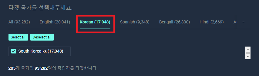 ③ 태스크의 효율을 위해서 타겟 국가를 설정할 수 있는데, 한국인들만 팔로우 또는 가입을 원하는 경우에는 위와 같이 Korean탭에서 South Korea만 선택하면 한국인들만을 대상으로 태스크를 운영할 수 있습니다.