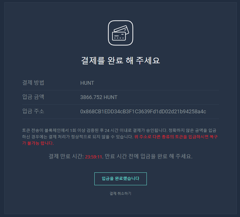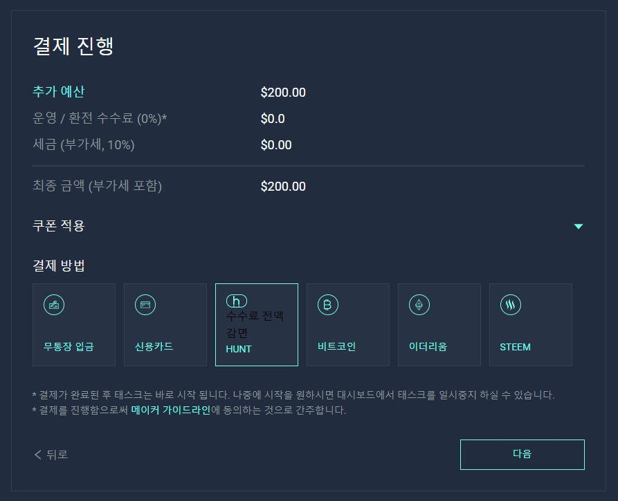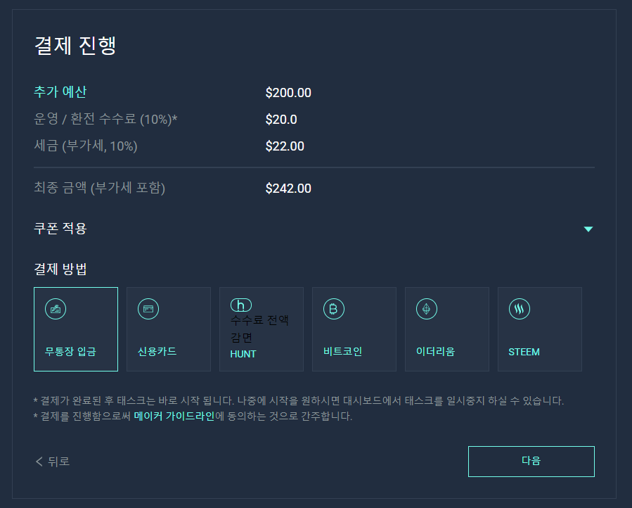 ⑨ 이제는 내가 만든 태스크에 참여한 헌터들에게 지급할 리워드를 결제해야 합니다(내가 결제한 돈으로 헌터들에게 보상을 지급하는 것이니까요). 무통장 입금, 신용카드와 같은 기존 결제방법과 헌트, 비트코인, 이더리움, 스팀과 같은 암호화폐를 이용한 결제 모두가 지원됩니다.