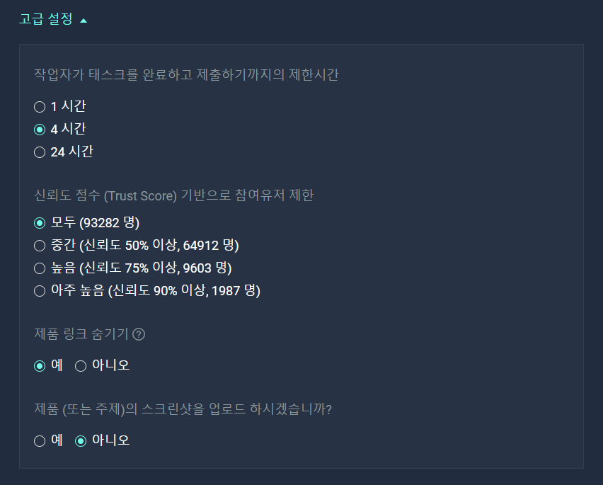 ⑦ 고급설정에서는 작업자(헌터)가 태스크에 참여하기 버튼을 클릭한 뒤에 증거물(스크린샷) 등을 제출할 때까지의 제한시간이나 링크(URL)의 숨기기 처리, 신뢰도에 따른 참여유저 제한 등의 디테일한 세팅을 할 수 있습니다.