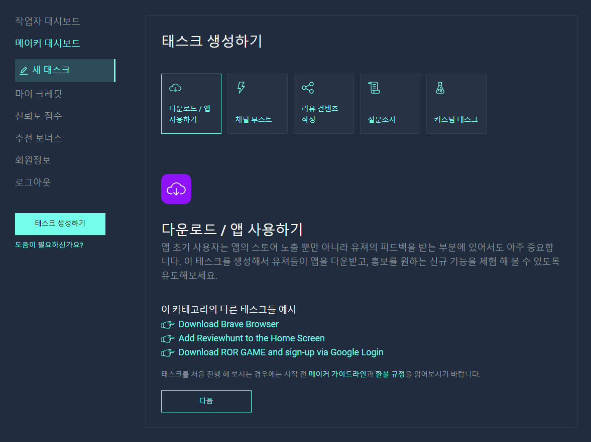 ② 태스크는 크게 다운로드/앱사용하기, 채널 부스트, 리뷰 컨텐츠 작성, 설문조사, 커스텀태스크까지 5개로 구분이 됩니다. 생성하고자 하는 태스크의 분류를 선택한 뒤에 [다음] 버튼을 클릭합니다.
