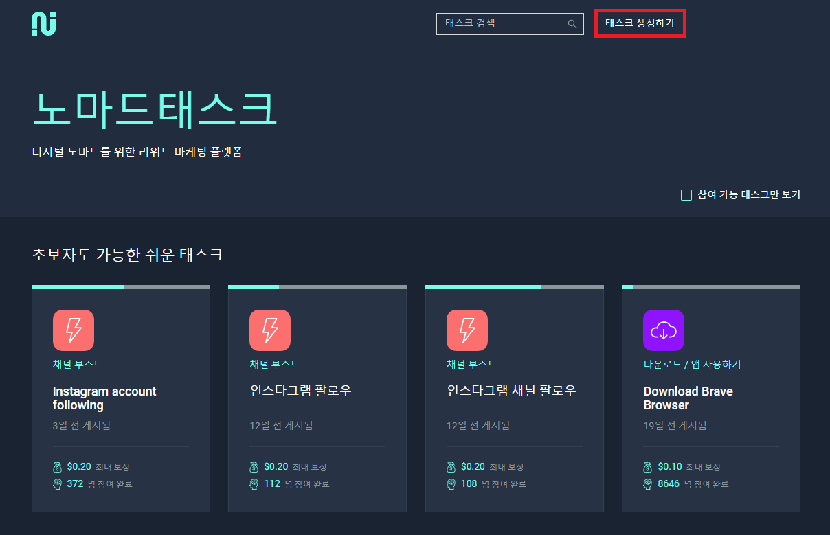 안녕하세요, 디온입니다. 오늘은 "봇이 아닌 실제 사람들로 팔로워를 늘리고 싶은 블로거" 또는 "시작한지는 얼마 안된 유튜브 채널의 구독자를 늘리고 싶은 유튜버", 아니면 "앱을 출시했는데 다운로드와 리뷰 수를 늘리고 싶은 개발자" 등 별도의 온라인 마케팅 업체를 통하지 않고 스스로 자신의 SNS 및 제품을 알리고 싶은 디지털 노마드의 필수 마케팅 플랫폼 노마드태스크(Nomadtask)에서 메이커가 되는 방법에 대해서 자세히 설명해보도록 하겠습니다.