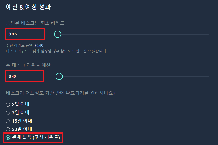 ⑥ 그리고 여기서 중요한 것이 "태스크가 어느정도 기간 안에 완료되기를 원하시나요?"라는 부분인데, [관계 없음(고정 리워드)]를 선택하는 경우에만 1인당 지급되는 리워드가 내가 설정한 금액으로 고정됩니다. 만일 3일 이내, 30일 이내 처럼 기간을 조정하는 경우에는 시간이 지남에 따라 비례적으로 1인당 지급 리워드가 올라가므로 꼭 필요한 경우에만 사용해야 하는 기능입니다.