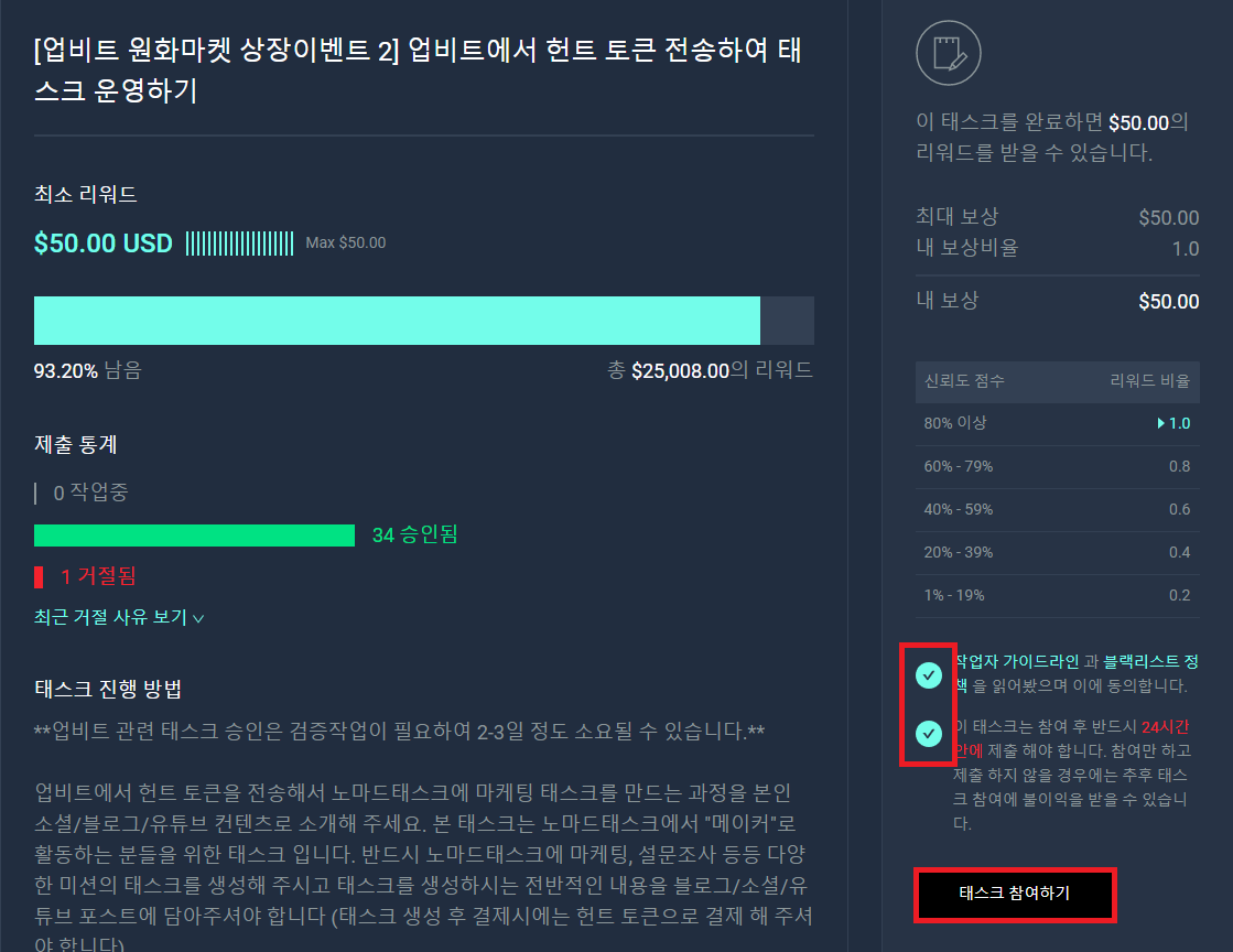 ② 해당 태스크에 참여를 하고 싶으면, 위와 같이 체크박스 2개를 클릭하고 [태스크 참여하기] 버튼을 클릭합니다. 그 다음 진행방법 안내에 따라 태스크를 수행하고 증거물(스크린샷 등)을 제출하면 완료!