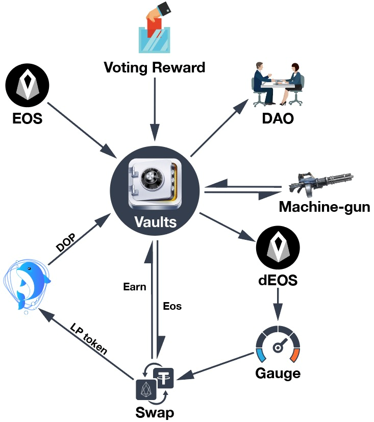 Vault는 사용자들의 EOS를 모아 더 많은 EOS를 획득하는 금고의 역할을 수행하며, 금고에 적립되는 EOS가 많아질수록 dToken의 가격은 1개의 EOS보다 자연스럽게 높아지게 됩니다.