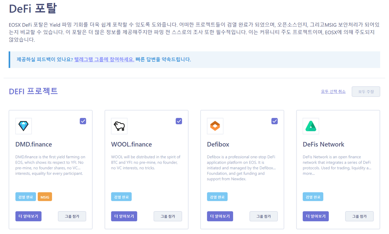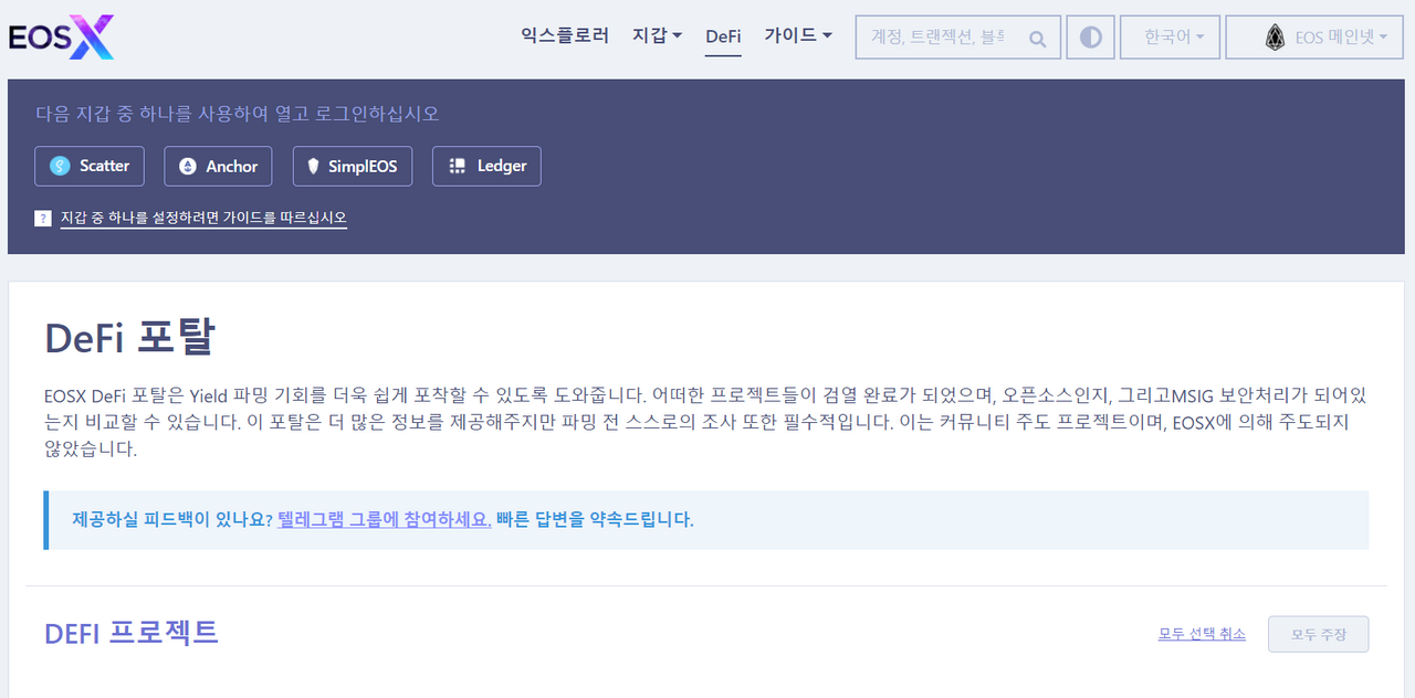 EOSX DeFi 포탈에는 DMD Finance, Wool Finance, Defibox, DeFis Network, Vigor, Coral, eHUB, DAPP Account DAC, Pizza live, Dolphinswap, Your Fancy Corp 등 거의 대다수의 디파이 프로젝트들이 리스팅되어 있고, 새로운 프로젝트들도 빠르게 추가가 되고 있어서 사용하기가 굉장히 편리합니다.
