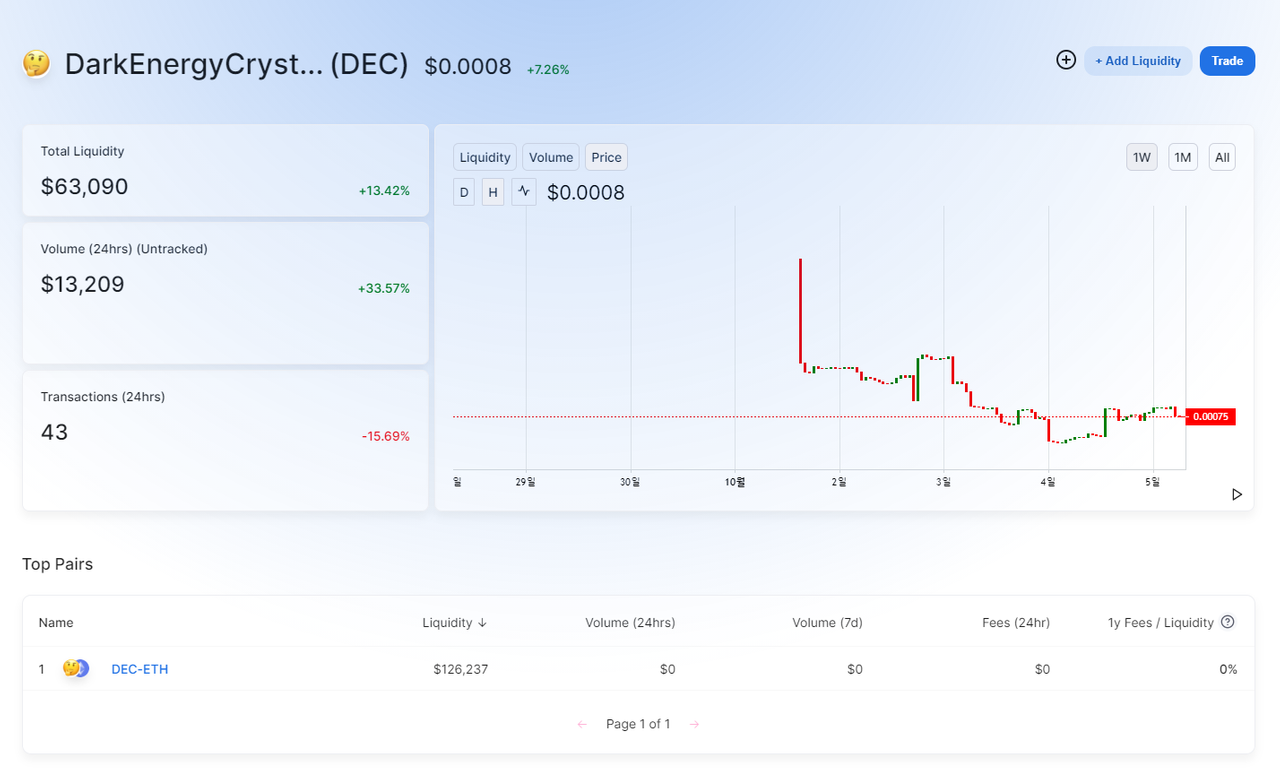 개인적으로 아직 랜드 프리세일과 관련된 세부적인 정보도 공개되어 있지 않은 상황에서, 비싼 트랜잭션 수수료와 ETH를 묶어서 유니스왑에서 유동성을 공급하는 것이 얼마나 큰 메리트가 있을지는 잘 모르겠습니다만, 유니스왑에서의 DEC/ETH 페어를 확인해보니 제 예상보다 꽤나 많은 금액의 DEC/ETH페어 유동성 공급이 진행 중인 것을 확인할 수 있었습니다.