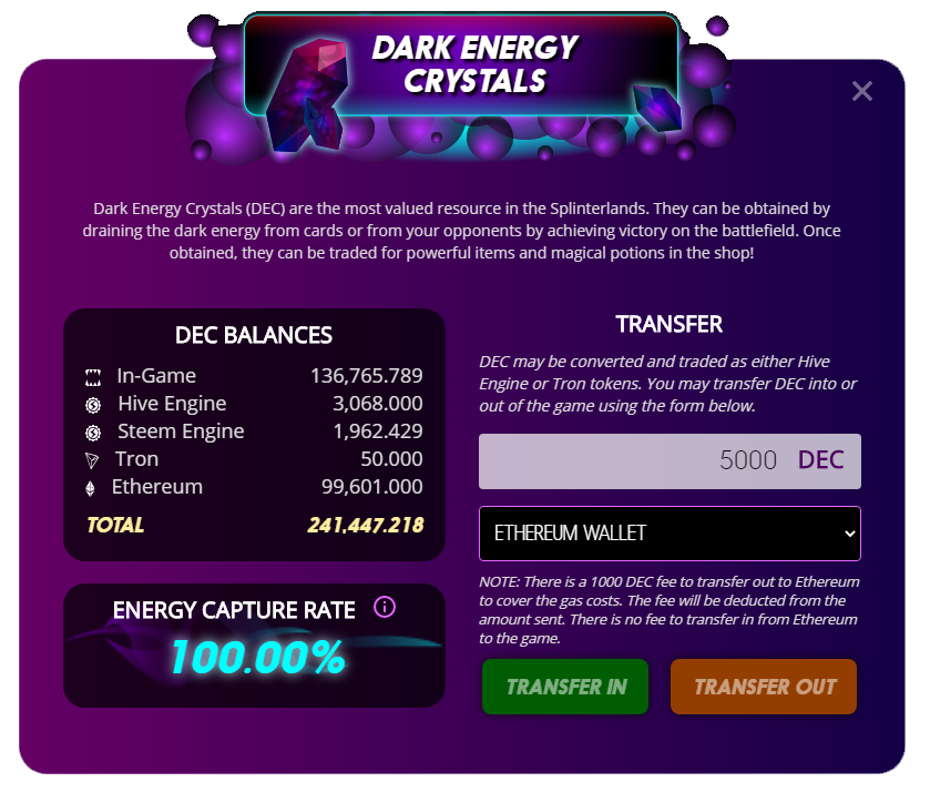 게임 계정 내에서 DEC를 보관 중이신 분들은 Transfer기능을 통해 DEC를 이더리움 기반 DEC로 인출하여 유니스왑 일드 파밍에 참여하실 수 있습니다만, 일반적인 스팀엔진이나 하이브엔진 출금과는 달리 이더리움으로 DEC 출금 시에는 1,000 DEC를 수수료로 지불해야 하므로 이를 주의할 필요가 있습니다.