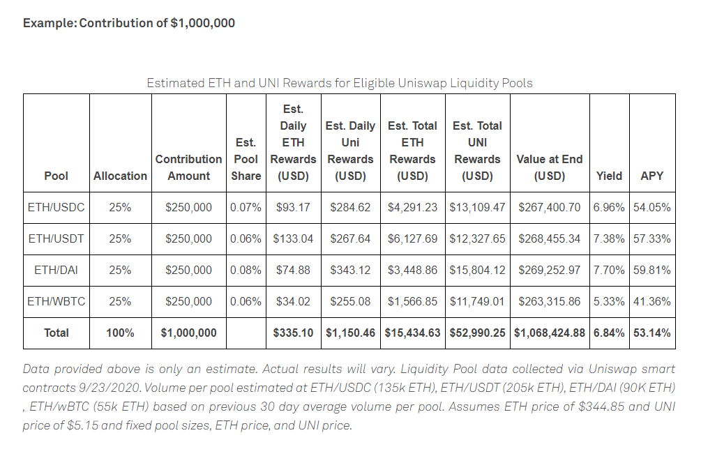 위의 표는 2020년 9월 23일 기준으로 유니스왑의 스마트 컨트랙트를 통해 수집된 유동성 풀 데이터입니다. 풀당 최근 30일 거래량을 기준으로 추정된 데이터로, ETH의 기준 가격은 $344.85이고 UNI토큰의 기준 가격은 $5.15를 기준으로 작성되었기 때문에 UNI마이닝에 참여하여 발생한 실제 실현 수익률은 다소 차이가 있을 수 있습니다.