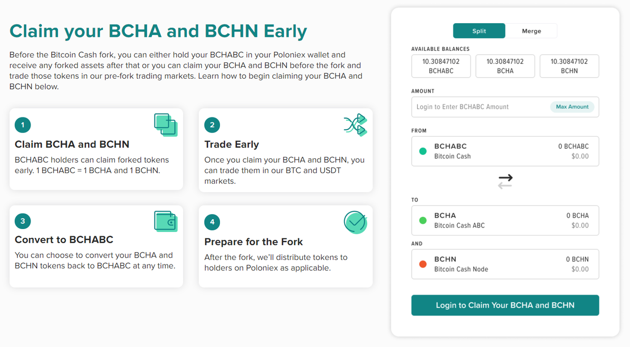 폴로닉스 지갑에서 1개의 BCHABC를 1 BCHA 및 1 BCHN으로 분할할 수 있으며, BTC나 USDT 페어링 마켓에서 하드포크일 전까지 트레이딩이 가능합니다.
