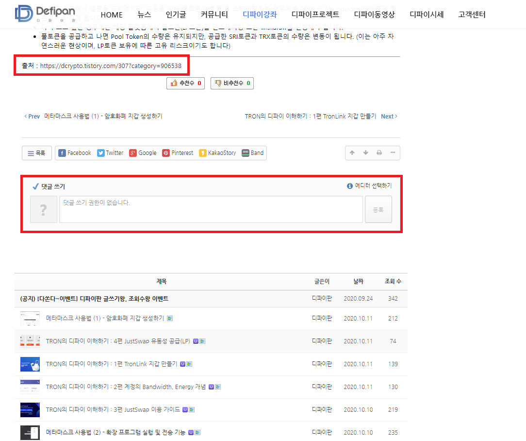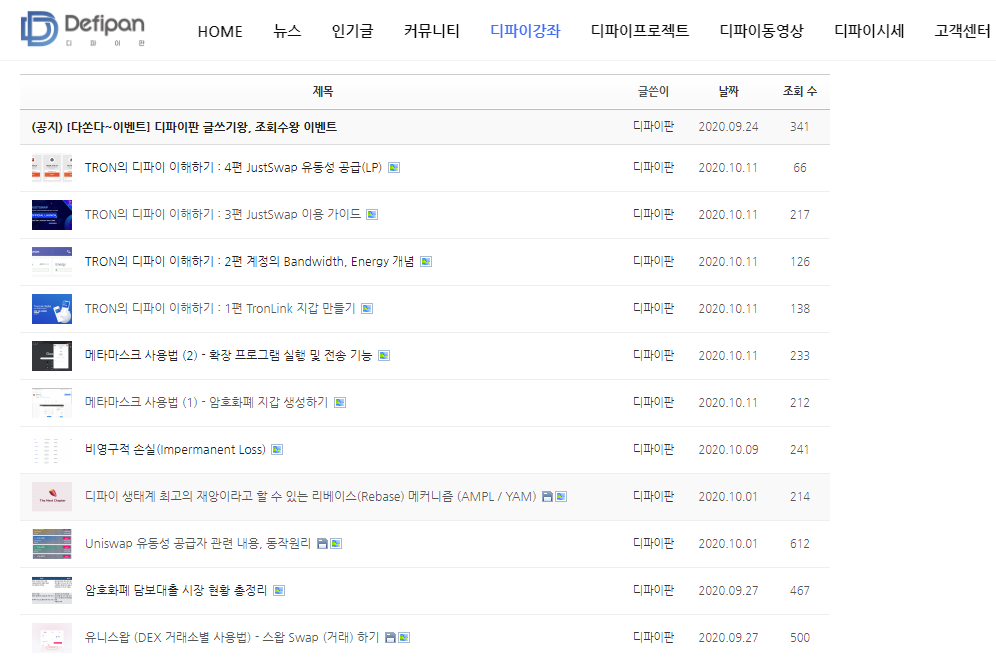 이런 저런 검색을 하다가 새롭게 런칭한 것으로 보이는 디파이판(defipan.com)이라는 사이트를 알게 되었습니다. 디파이 전용 코인판 같은 커뮤니티를 만들려고 하는 것 같고 만들어진지는 얼마 안 된 곳으로 보입니다. 올라와 있는 글들을 살펴보는데, 뭔가 익숙한 제목의 글들이 보이기 시작합니다.