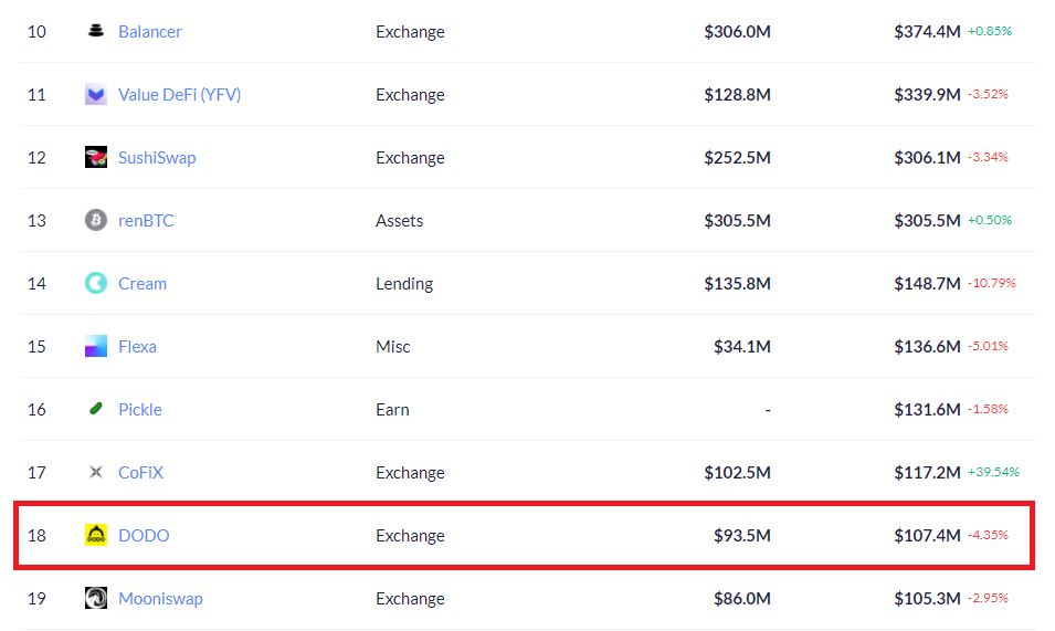 사실 프라이빗 투자 라운드에서의 참여 VC리스트만 참고하면 DODO토큰에 FOMO가 생길 수도 있는데, 현재로서는 이미 디파이 생태계에 진작에 출시된 경쟁 프로젝트들이 견고하게 상위권에 포진하고 있는 관계로 TVL(Total Value Locked)나 거래량 측면에서는 Fomo가 올 정도는 아니라고 생각이 됩니다.
