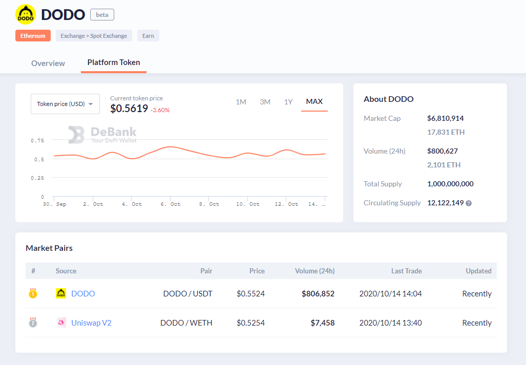 지난 2020년 9월 29일 DODO거래소(https://app.dodoex.io/exchange)를 통해 사전 판매(IDO)를 진행한 물량은 총 공급량의 1%인 1,000만 개로 DODO-USDT페어를 통해 IDO에서 구매가격은 0.1달러였기 때문에, 약 2주가 지난 현재 DODO토큰의 가격이 이미 IDO가격 대비 5~6배 수준으로 상승해 있는 상황입니다.