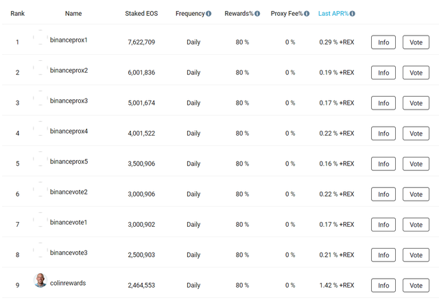 등록되어 있는 프록시는 binanceprox1~5, binancevote1~5, binanceprxy1~5까지에 해당하며 제일 크게는 약 760만 EOS부터 제일 적은 수량은 약 100만 개에 해당하는 엄청난 수량입니다.