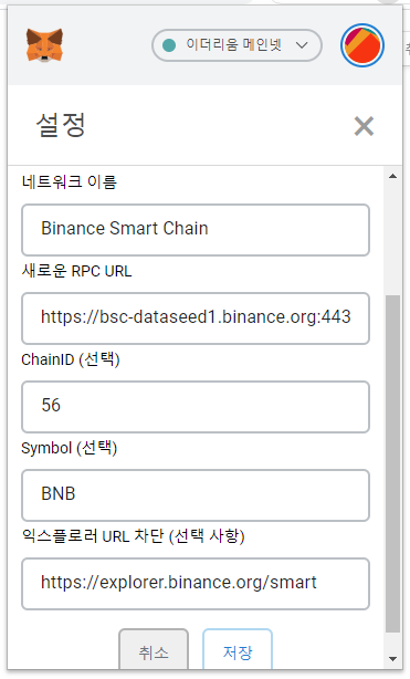 - 새로운 RPC URL(New RPC URL) : https://bsc-dataseed.binance.org
