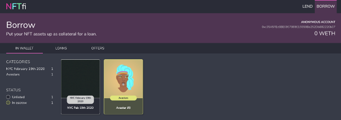 대출을 받는 방법은 NFTfi.com에서 메타마스크 등으로 로그인 후 Borrow탭으로 이동하면, 지갑에 보유 중인 NFT자산을 확인할 수 있는데 여기서 담보로 제공하고자 하는 자산을 선택하고 "list as collateral"(담보로 제공)을 클릭하면, 해당 자산이 마켓플레이스에 올라가게 됩니다.