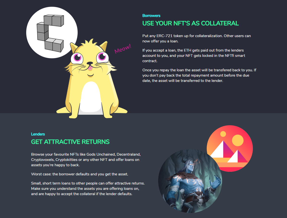 안녕하세요, 디온입니다. 디파이 생태계의 엄청난 성장과 대체불가토큰(NFT)이 디파이 다음 트렌드로 떠오르면서 대체불가토큰(NFT)을 담보로 제공하고 유동성을 빌릴 수 있는 DeFi와 NFT의 결합 플랫폼이 등장하고 있습니다. 크립토키티나 더 샌드박스의 LAND토큰 등 대체불가토큰을 보유 중인 분들은 NFTfi.com에서 해당 NFT를 담보로 제공하고 유동성(코인)을 빌릴 수 있습니다.